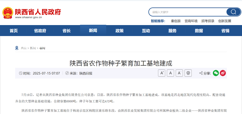 【陜西省人民政府】陜西省農(nóng)作物種子繁育加工基地建成