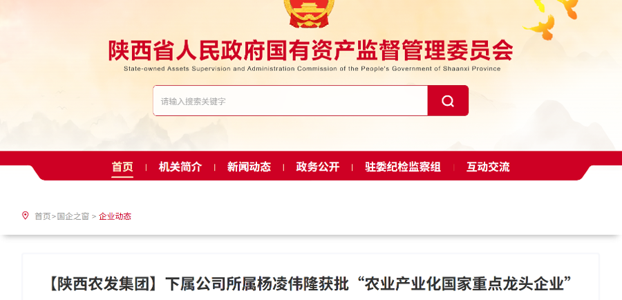 【陜西省人民政府國有資產(chǎn)監(jiān)督管理委員會】陜西農(nóng)發(fā)集團下屬公司所屬楊凌偉隆獲批“農(nóng)業(yè)產(chǎn)業(yè)化國家重點龍頭企業(yè)”